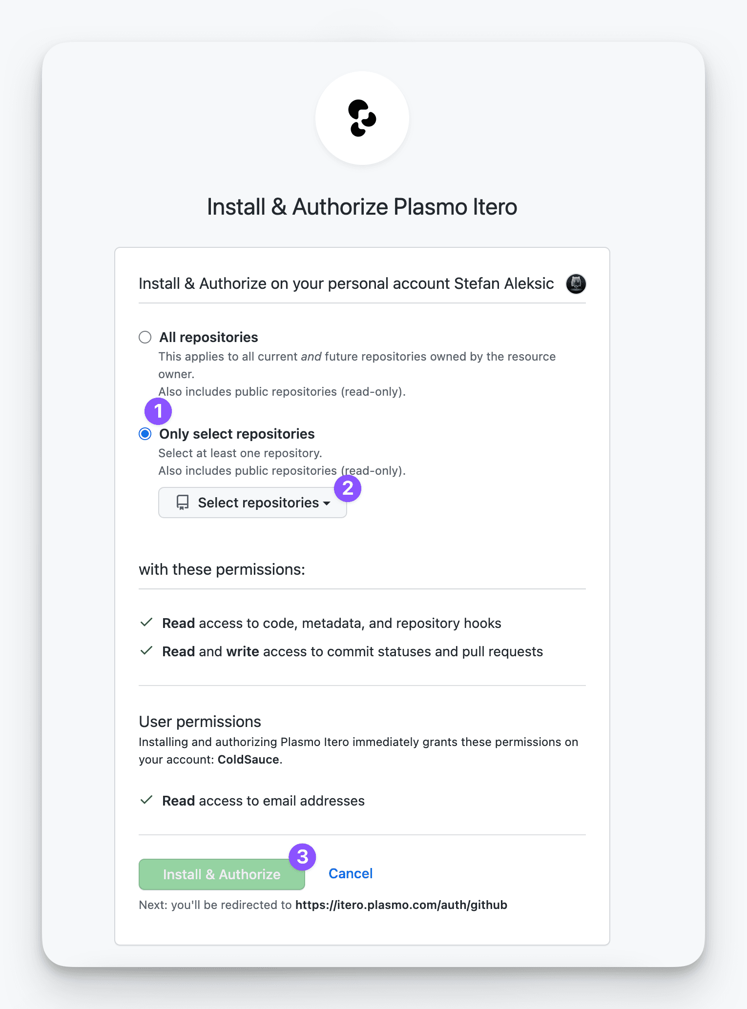 Once you have your extension on Itero, you need to link your GitHub organization to Itero. This is done by installing the GitHub App on your organization, selecting the repositories that you'd like Builder to have access to, and then linking your organization and repository name on your extension's settings page.